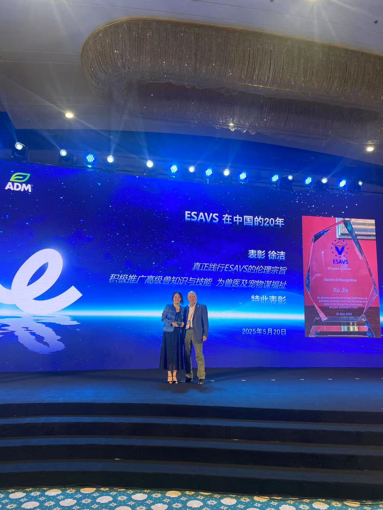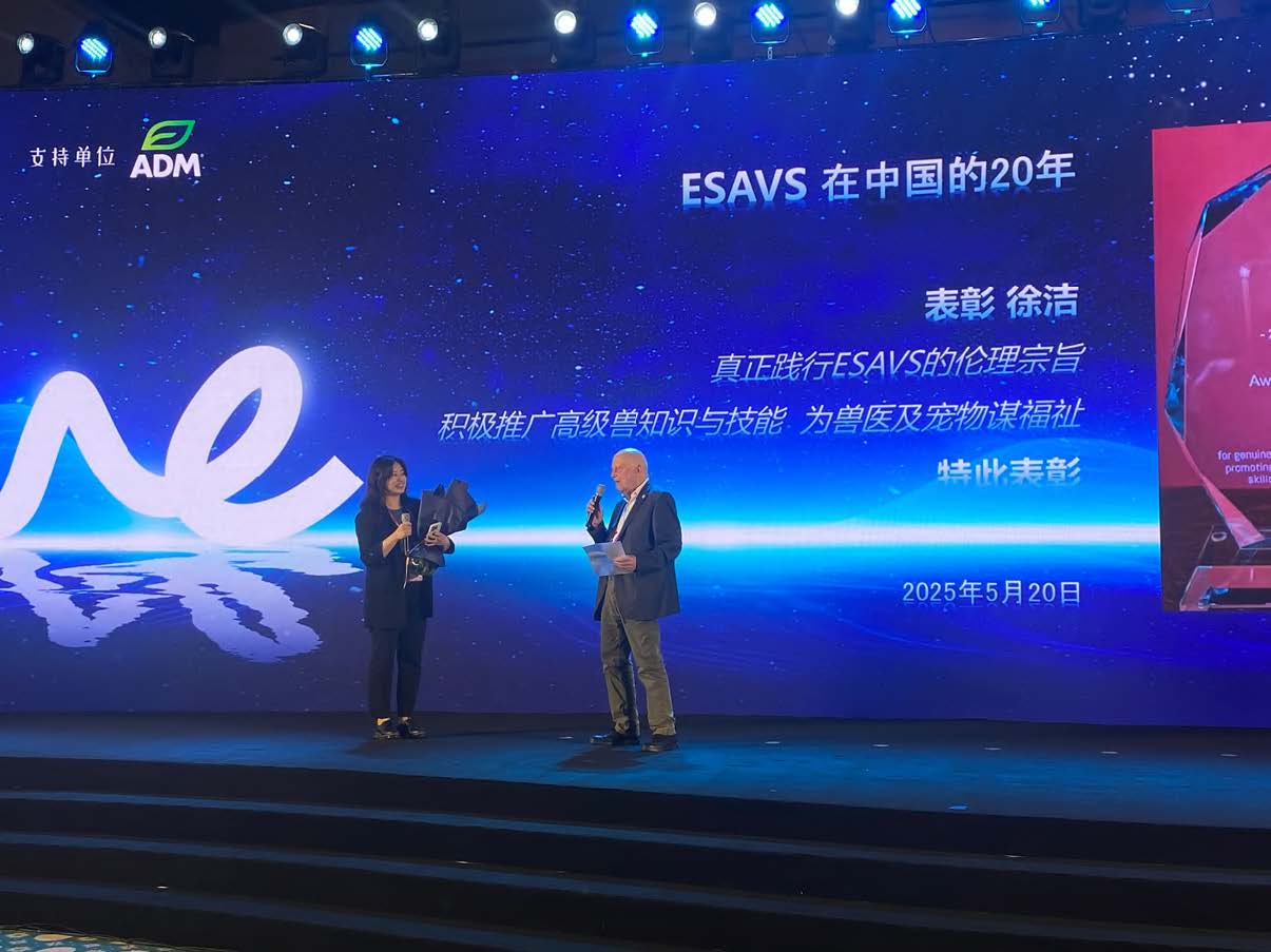 ESAVS Asia award of recognition for Xu Jie, China local coordinator, for the genuine commitment to the ESAVS ethics of promoting advanced veterinary knowledge and skills in the interest for veterinarians and pets entrusted to them in China.